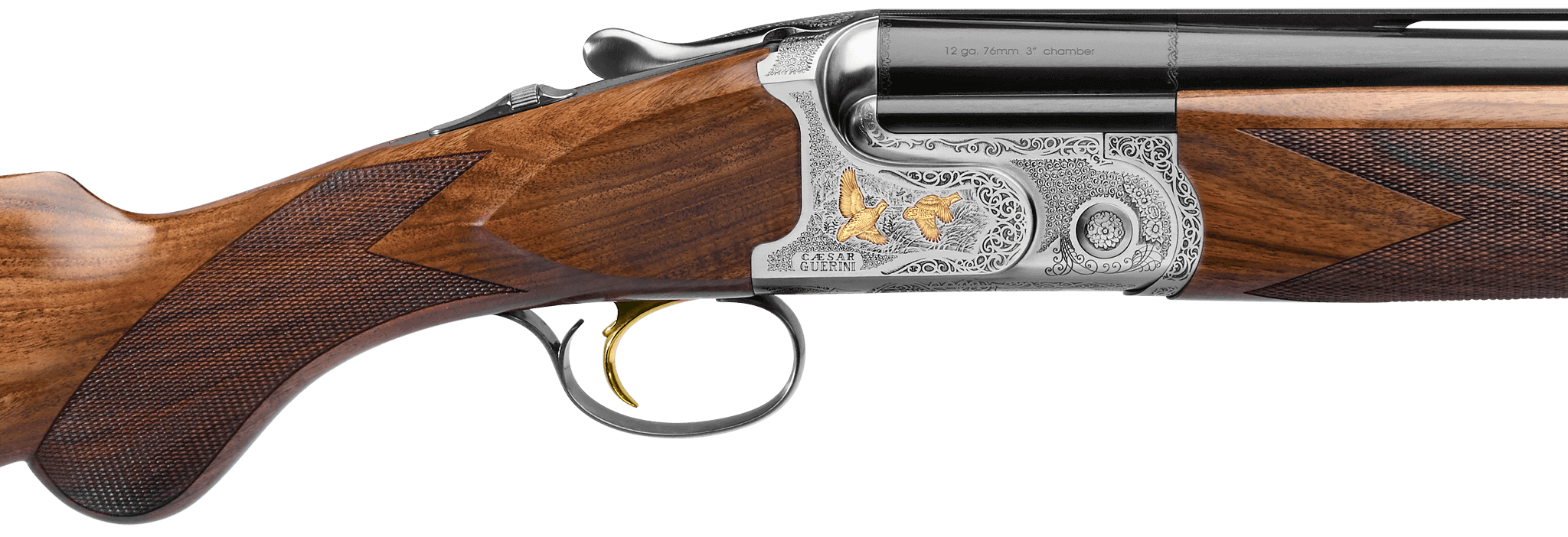The Tempio Field’s low-profile receiver matched with a trim stock, classic Prince-of-Wales grip and Schnabel fore-end make the gun a perfect match for fast game birds. The Tempio features a contemporary style of “ornato” scroll with tasteful gold accents. The action is further enhanced by a nickel finish protected by a proprietary Invisalloy™ coating. Each Caesar Guerini game gun is carefully engineered to balance near the hinge point, distributing the weight evenly between the hands, which is the secret to a finely crafted shotgun. The Tempio also features a deluxe grade of Turkish walnut enhanced with a hand rubbed oil finish.